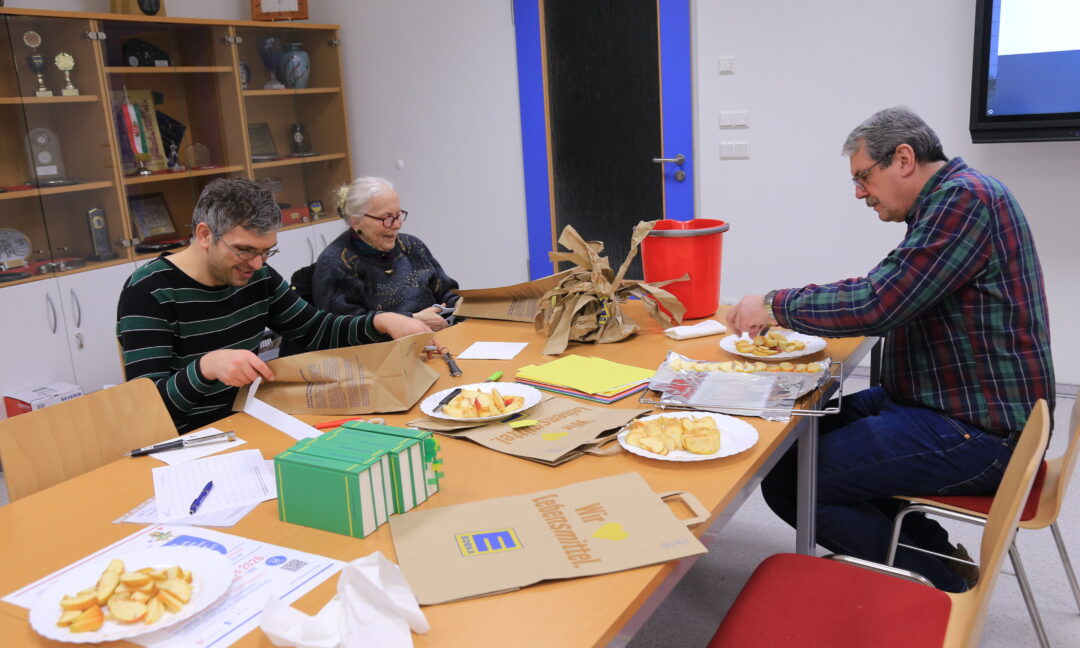 Horstka ludźi bě přichwatała, zo bychu sej w rjanej zhromadnosći sušenki abo pječenki – krali a pjekli. Nimo toho smy sej tak mjenowanu “Klinkotatu lipku” stworili. Při tym smy, kaž je na wobrazu widźeć, titki za nakupowanje wužiwali, a roztřihali. Tak nastachu lute, małke, šlewjerki kotrež smy potom hromadźe wili. Zbytk titki słužeše nam jako zdónk. A do hałuzow smy potom lipowe łopješka tykli. Na tutych lipowych łopješkach stejachu potom spěwy kaž “Ha widźu-li ptačata ćahnyć” abo “Sněh so saje.” Tute smy sej po zhotowjenju wězo tež zhromadnje zaspěwali.